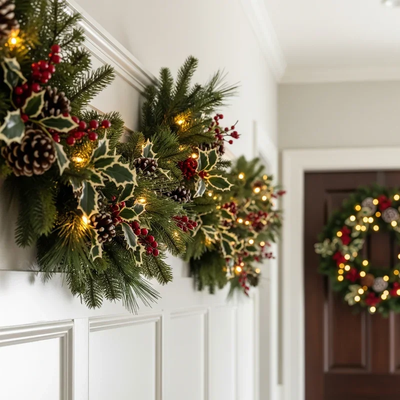 Office hallways often feel like forgotten spaces, but strategic garland and wreath placement can transform these thoroughfares into festive pathways that connect different departments. Artificial garland wrapped with battery-operated lights and secured along walls creates continuous decoration that guides people through the office while spreading cheer. Coordinate wreath styles throughout the building for visual consistency, perhaps using different ribbon colors to identify different floors or departments. Add small ornaments or company-branded elements to personalize these traditional decorations. Position wreaths at regular intervals to create rhythm and visual interest, turning mundane walks between meetings into mini holiday experiences. These linear decorations work especially well in long corridors where other decoration options might obstruct traffic flow.