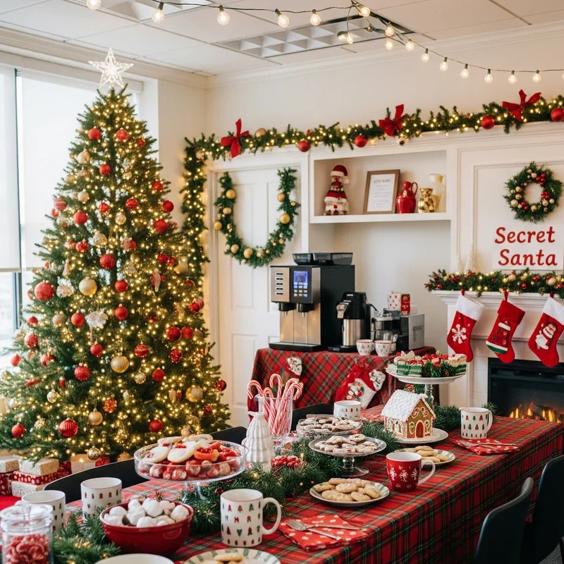 The break room serves as your office's social hub, making it ideal for concentrated holiday decoration efforts that maximize impact. Replace regular coffee mugs with festive ones, swap standard napkins for holiday patterns, and add a hot chocolate station complete with marshmallows and candy canes. String lights around the perimeter create ambient lighting perfect for relaxation, while a small tabletop tree adorned with coffee-themed ornaments adds personality. Consider adding comfortable holiday throw blankets to seating areas and displaying a rotating selection of holiday treats from different cultures to celebrate diversity. This space should feel like a cozy retreat where employees can recharge their batteries and enjoy informal celebrations throughout the busy season.