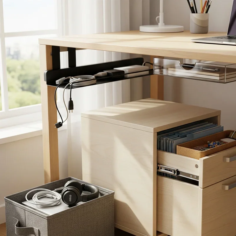 The space beneath your desk represents untapped storage potential that many people overlook in their quest for organization. Rolling file cabinets slide out when needed and tuck away when you want more legroom. Hanging organizers attach to the underside of your desk, keeping supplies accessible but out of sight. Consider a footrest with built-in storage compartments that serves dual purposes. Cable management boxes hide power strips and excess cords while keeping them easily accessible. This often-forgotten area can house everything from office supplies to personal items, freeing up your desktop for actual work. By thinking creatively about under-desk storage, you effectively double your storage capacity without adding any furniture that takes up additional floor space in your compact office.