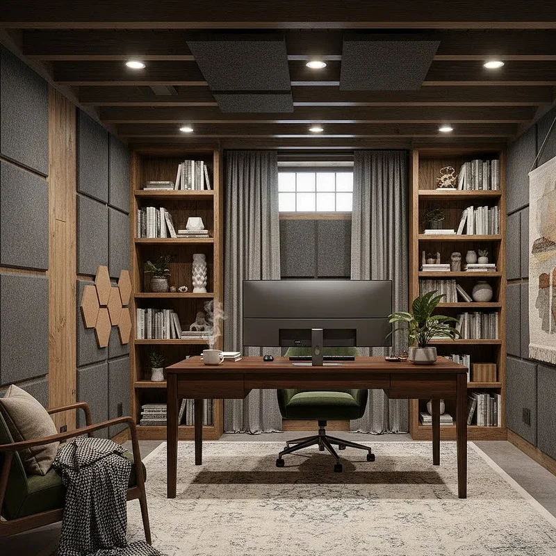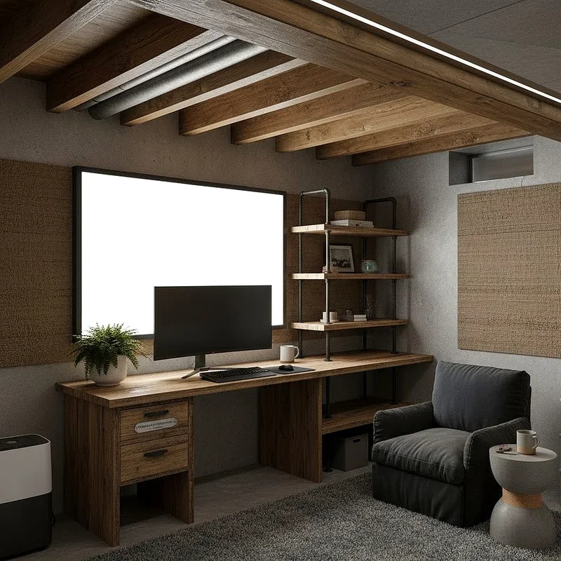 Basements can echo or transmit sound in unexpected ways, making acoustic treatment important for comfortable, focused workspaces. Sound absorbing panels mounted on walls or ceilings reduce echo and create better conditions for video calls. Thick curtains, upholstered furniture, and that plush rug we discussed earlier all contribute to sound dampening. If your basement shares walls with mechanical rooms or other noisy areas, additional soundproofing may be necessary. Acoustic solutions range from decorative fabric panels to foam treatments that also add visual interest. Better acoustics reduce fatigue from constant background noise and create the peaceful environment essential for deep work. These improvements benefit both your concentration during solo work and audio quality during virtual meetings. Proper sound management transforms potentially problematic basement acoustics into a professionally quiet workspace.
