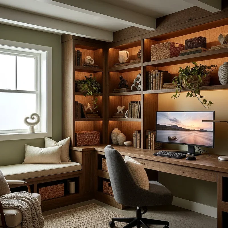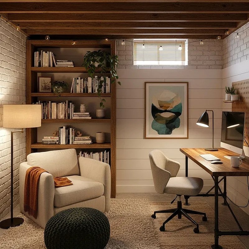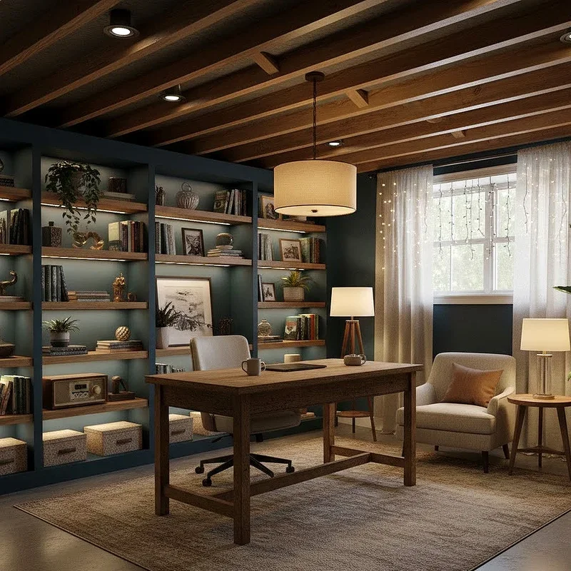 Clutter kills productivity and coziness, making smart storage absolutely essential in your basement office. Built in shelving, cabinets, and drawers maximize every inch of space while keeping supplies organized and accessible. Utilize the unique architecture of basements, like under stair storage or alcoves, to create custom solutions that fit perfectly. Floor to ceiling shelving makes use of vertical space and keeps your desk surface clear for actual work. Consider closed cabinets for items you don't need daily and open shelving for books and decorative objects that add personality. Built ins look intentional and finished, elevating your basement from afterthought to thoughtfully designed workspace. This investment in organization creates the calm, uncluttered environment that supports deep focus and creative thinking.