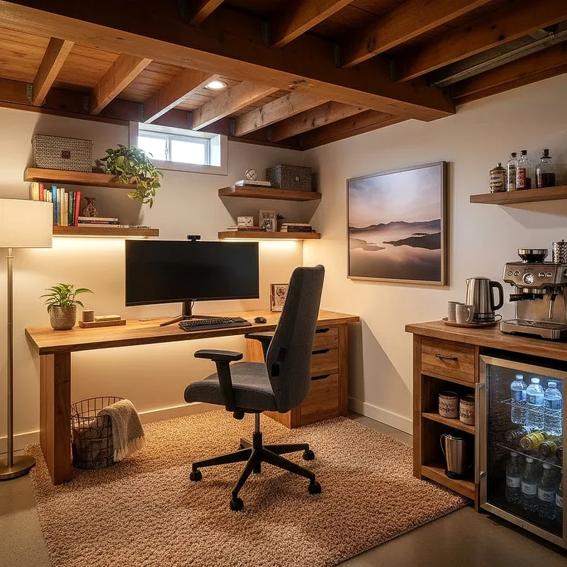 A dedicated refreshment station in your basement office eliminates trips upstairs for coffee or snacks, maintaining workflow while adding convenience and coziness. A small beverage fridge, coffee maker, and storage for mugs and supplies create a mini break room within your workspace. This station encourages regular hydration and provides the perfect excuse for short mental breaks without leaving your productive zone. Stock it with your favorite drinks, healthy snacks, and treats that make your workday more enjoyable. The ritual of making fresh coffee or tea provides natural transition moments between tasks. This small luxury makes your basement office feel complete and self sufficient, almost like having your own private café. The refreshment station transforms your workspace from purely functional to genuinely hospitable, supporting both productivity and wellbeing throughout your day.