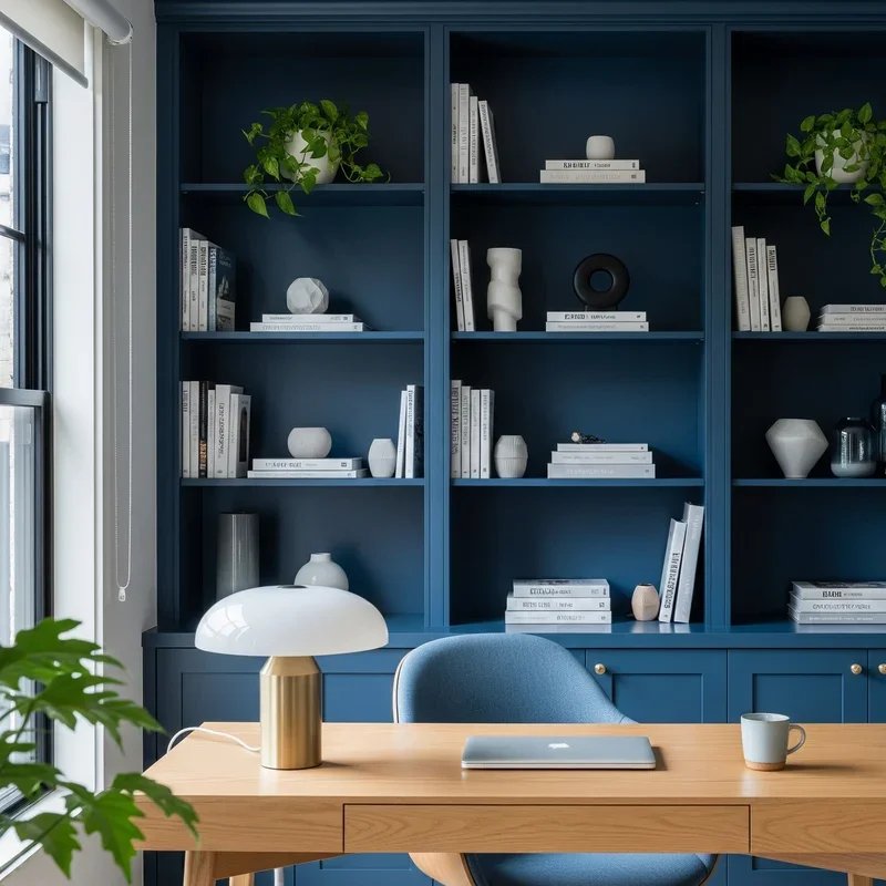Maximize storage and style with midnight blue built-in shelving that turns your walls into functional art. This deep, almost-black blue creates dramatic contrast against light walls while providing a sophisticated backdrop for books, awards, and decorative objects. Custom built-ins painted in midnight blue feel like expensive architectural features, even when created from simple board and bracket systems. The color's depth makes items displayed on the shelves appear to float, creating visual interest and drawing the eye upward to make rooms feel taller. Style your shelves with a mix of practical storage boxes and decorative pieces in complementary colors. Add integrated lighting to highlight special items and create ambiance during evening work sessions.