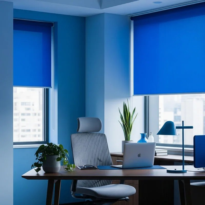 Dress your windows in royal blue curtains or blinds to control light while adding regal sophistication to your workspace. This rich shade provides excellent light filtering, reducing screen glare during those long computer sessions while maintaining privacy for confidential work. Roman shades in royal blue velvet add texture and luxury, while sleek blue venetian blinds offer a more contemporary feel. Layer sheer white curtains underneath for versatility in light control throughout the day. The dramatic impact of royal blue window treatments can't be overstated; they frame your view like artwork while tying together other blue elements in your office. Choose blackout options for video recording spaces or meditation corners where complete darkness is sometimes needed.