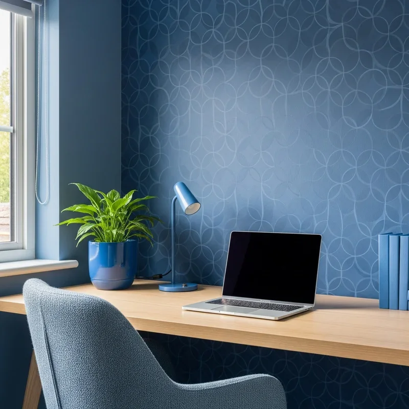 Master the art of pattern mixing by combining different blue prints and textures for a layered, designer look that feels collected over time. Stripe, plaid, geometric, and floral patterns in various blue shades create visual rhythm when balanced correctly. Start with a large-scale pattern like a bold striped rug, then layer in smaller patterns through cushions, artwork, and accessories. Mix smooth surfaces like glossy blue ceramic with rough textures like navy burlap for tactile interest. The secret lies in maintaining a consistent color temperature across all blues, whether cool or warm tones. This approach prevents your office from feeling flat or one-dimensional while showcasing your personality and design confidence.