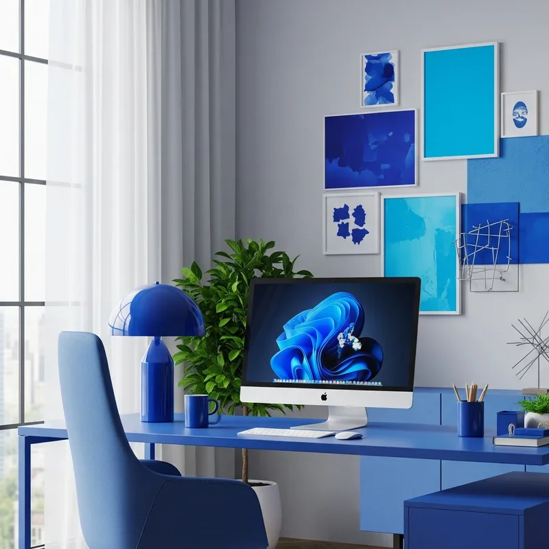 Energize your walls with electric blue artwork and decorative elements that inject personality and inspiration into your daily grind. Abstract paintings featuring electric blue create movement and energy, perfect for creative professionals who need visual stimulation. Gallery walls mixing electric blue prints with black and white photography offer sophisticated contrast that feels curated and intentional. Consider removable wall decals in electric blue geometric patterns for renters who can't paint. Neon signs in blue add a modern, edgy vibe while providing ambient lighting for late-night work sessions. The key is balancing these bold pieces with neutral surroundings so they enhance rather than overwhelm your concentration.