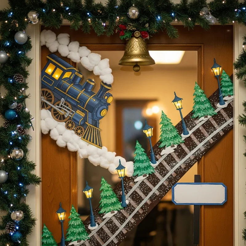 All aboard for a magical door decoration that captures the wonder and excitement of the beloved Polar Express story. Create a train engine at the bottom of your door with smoke billowing up toward the North Pole, depicted at the top with twinkling stars. Add windows to your train cars showing excited passengers, perhaps including photos of team members for personalization. Include a golden ticket holder where colleagues can take their own "tickets" with holiday wishes or motivational messages. Use metallic paper for the train to give it that authentic steam engine appearance, and add train track details running along the door's bottom edge. This nostalgic design appeals to both children and adults who visit your office, creating talking points and spreading holiday magic. The journey theme resonates with year-end reflections and looking forward to new adventures in the coming year.