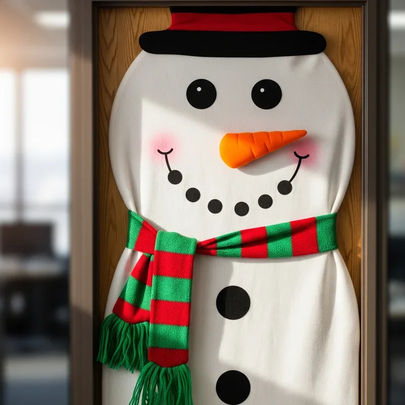Create a life-sized Frosty right on your door with this charming and approachable decoration idea that brings smiles to everyone. Use three large white circles to form the snowman's body, proportioned to fit your door perfectly from top to bottom. Add a carrot nose made from orange paper, coal buttons from black circles, and a warm scarf using fabric or crepe paper strips. Top it off with a classic black top hat and stick arms reaching out as if ready for a warm hug. Consider adding rosy cheeks and a friendly smile to give your snowman personality that reflects your team's welcoming nature. This design works especially well on white or light-colored doors where the snowman seems to blend naturally with the surface. It's a timeless choice that never goes out of style and appeals to the child in all of us.