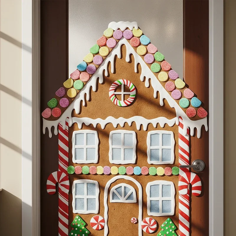 Bring the sweet charm of a gingerbread house to life on your office door with this delicious-looking decoration idea. Use brown paper as your base to mimic gingerbread, then add white paint or paper strips to create the iconic icing details along edges and rooflines. Colorful circle cutouts become gumdrops and candies, while twisted white and red paper creates perfect candy cane columns. Don't forget to add window shutters made from chocolate bar wrappers and a door within a door concept using darker brown paper. Cotton balls work wonderfully as smoke coming from a paper chimney, adding that cozy holiday touch. This design appeals to everyone's sweet tooth while maintaining a professional appearance that won't seem out of place in your workplace. The whimsical nature of this decoration spreads joy and nostalgia throughout the office environment.