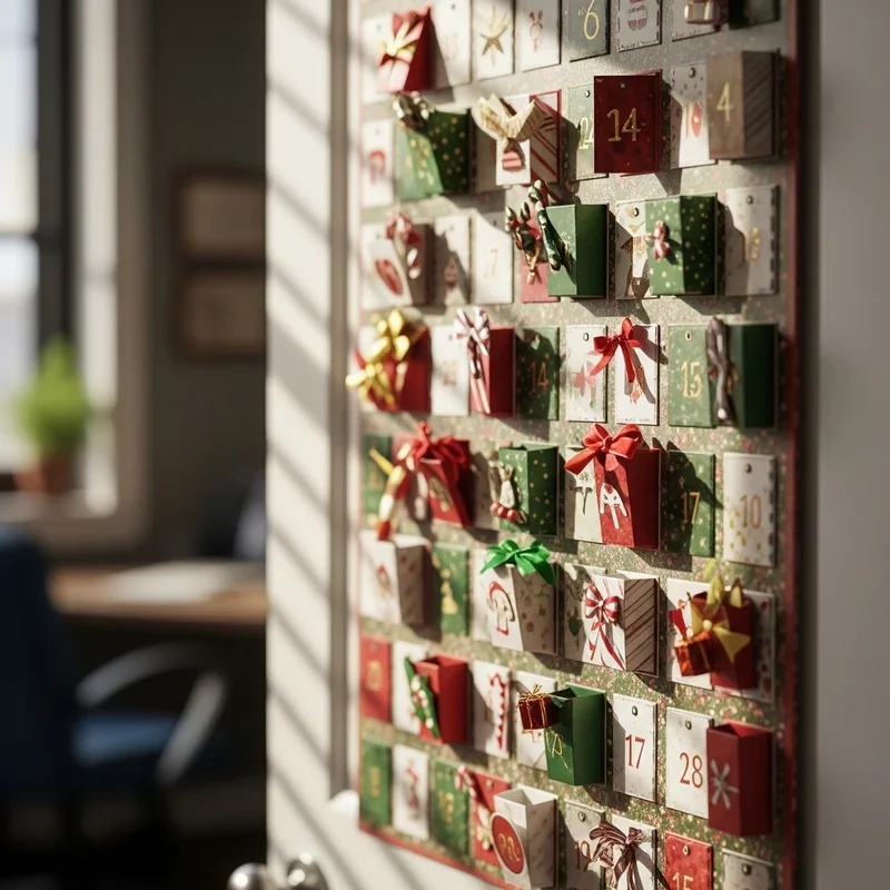 Create an engaging countdown to Christmas that turns your door into a daily surprise for the entire office to enjoy together. Design 25 pockets or envelopes arranged creatively across your door, each numbered and containing treats, jokes, motivational quotes, or team challenges. Make the pockets from festive paper in various patterns, ensuring they're sturdy enough to hold small items throughout December. Encourage participation by having different colleagues responsible for filling specific days, building community and anticipation as Christmas approaches. Add decorative elements around the calendar like garland borders, twinkling lights, or festive characters watching over the countdown. This interactive design transforms your door into a destination rather than just decoration, fostering team building and daily excitement. Everyone will look forward to discovering what each new day brings, making the entire month feel special and connected.