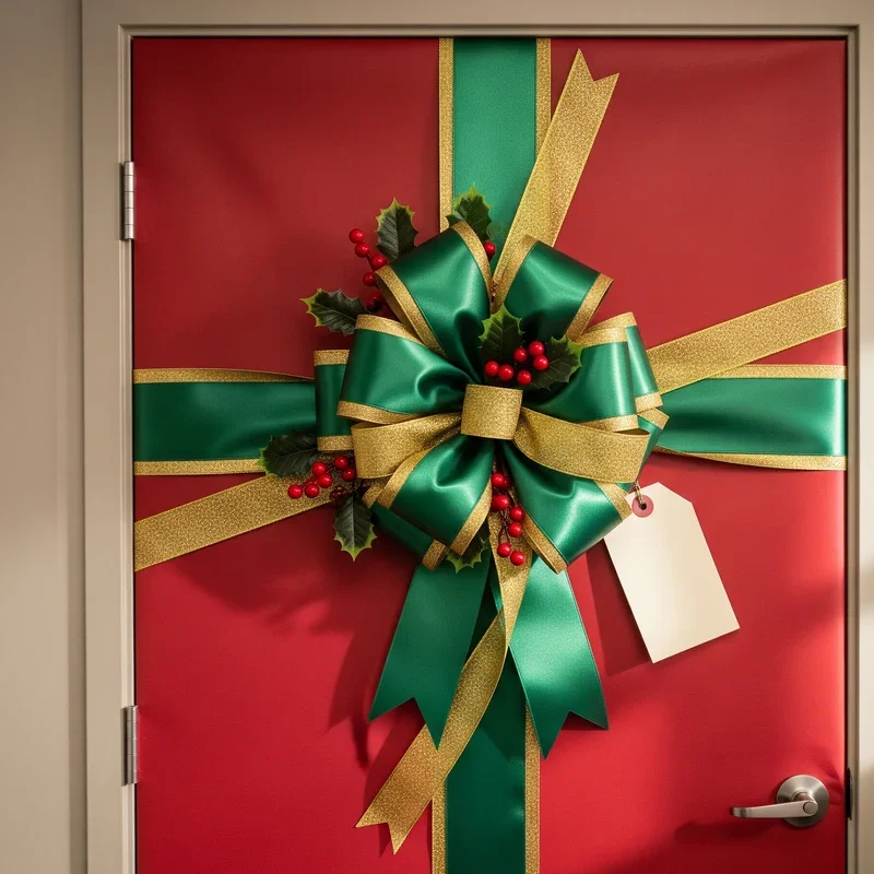 Turn your entire door into an oversized present that makes everyone feel like a kid again on Christmas morning. Start with wrapping paper that complements your office decor, covering the door completely as if you're wrapping an actual gift. Create a massive bow using wide ribbon or fabric, positioning it strategically at the door's center or slightly off to one side for visual interest. Add a giant gift tag with a cheerful message like "To: Our Amazing Team" or personalize it with department names. You can even incorporate 3D elements by stuffing the bow with tissue paper for extra dimension. This simple yet effective design takes minimal time but delivers maximum impact. Plus, it photographs beautifully for those inevitable social media posts and company newsletters that showcase holiday spirit around the office.