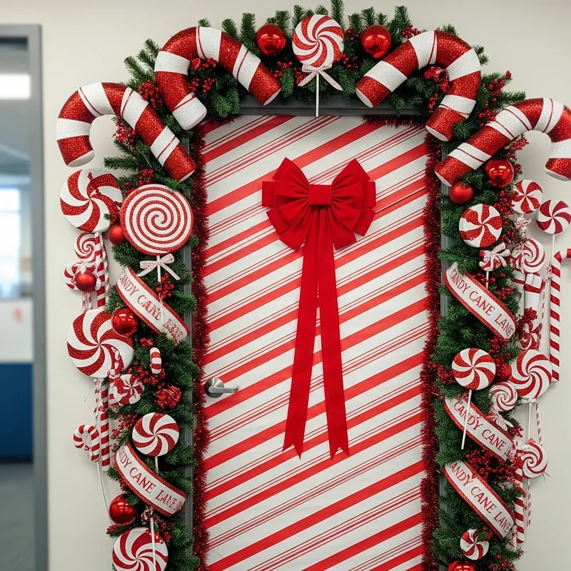 Transform your doorway into a sweet street scene straight out of a candy lover's dream with this delightful decoration concept. Line both sides of your door frame with large candy cane cutouts, creating an archway effect that draws people in. Add a street sign reading "Candy Cane Lane" at the top, complete with arrow directions to imaginary sweet destinations. Incorporate peppermint swirls, lollipops, and gummy bear cutouts throughout the design for variety and visual interest. Use red and white striped patterns extensively, perhaps even creating a brick road effect at the door's base using alternating colored rectangles. This sugary sweet theme works particularly well in offices with a fun, energetic culture where creativity is celebrated. The bright colors and playful theme instantly lift spirits and create a cheerful atmosphere that makes the workplace feel more inviting.