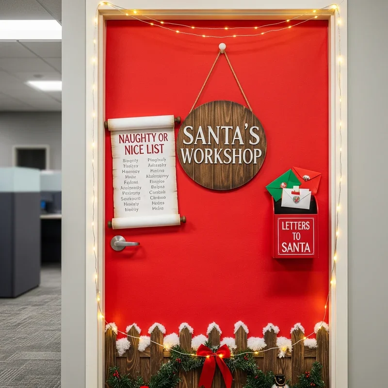Who doesn't love the idea of peeking into Santa's busy workshop during the holiday season? Cover your door with red brick paper to create the workshop exterior, then add a large window cutout revealing elves hard at work inside. Use colorful paper to craft tiny elves, toys on shelves, and workbenches filled with holiday magic. Add a sign reading "Santa's Workshop" in festive lettering above the door, complete with twinkling battery-operated lights. Include a toy list pinned to one side and maybe even a clock showing how many days until Christmas. This interactive design invites colleagues to stop and admire all the tiny details you've incorporated. Your coworkers will appreciate the creativity and effort that goes into making their workplace feel more festive and fun.
