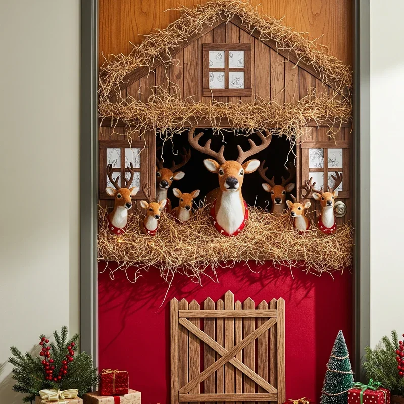 Welcome visitors to Rudolph's stable with this creative door design that brings Santa's faithful helpers front and center. Cover the door with wood-grain paper to simulate stable walls, then add a large window showing several reindeer faces peering out curiously. Create antlers from brown paper and add red noses (making sure Rudolph's glows brightest) using shiny paper or even a small battery-operated light. Hay made from shredded yellow paper at the bottom adds authentic texture, while a sign reading "Reindeer Stable" or "Dasher, Dancer, Prancer, and Vixen" adds storytelling elements. Include jingle bells and a feeding schedule for humorous touches that engage passersby. This unique approach stands out from typical door decorations while maintaining that magical Christmas feeling everyone craves during the holidays. Your coworkers will appreciate the creativity and attention to detail.