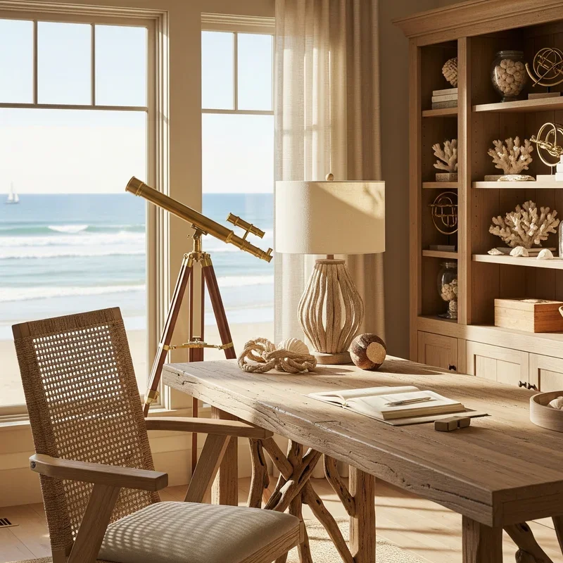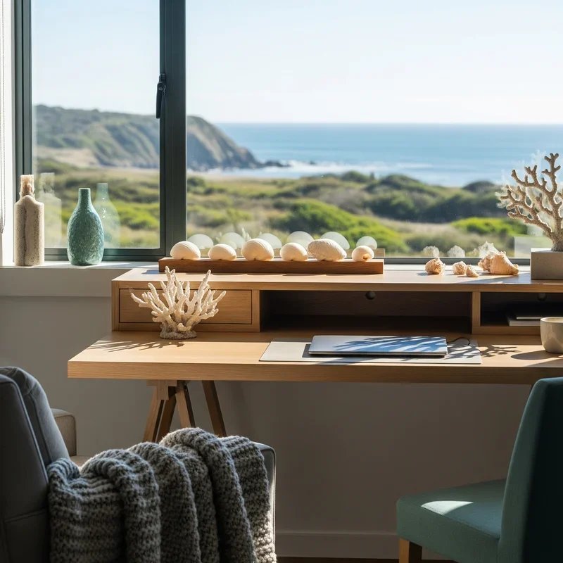 When thoughtfully curated and sparingly displayed, shells and coral specimens elevate your office from generic to genuinely coastal without venturing into souvenir shop territory. Focus on quality over quantity – a single large nautilus shell displayed on a stand becomes a natural sculpture, while a collection of sea urchin shells arranged in a shadow box creates sophisticated wall art. Display delicate coral branches under glass cloches to protect them while creating museum-quality vignettes on shelves or credenzas. Use shells functionally as well as decoratively – large clam shells can hold business cards, while smaller shells scattered in a glass tray become a zen garden for fidgeting fingers during phone calls. The key is authenticity; shells you've personally collected carry more meaning than mass-produced decorations. Create seasonal displays that change throughout the year, preventing visual fatigue while maintaining fresh interest. These natural elements serve as tangible connections to the ocean, providing moments of calm contemplation during busy workdays.