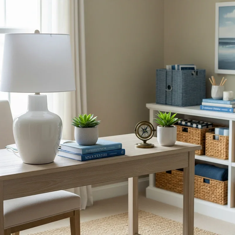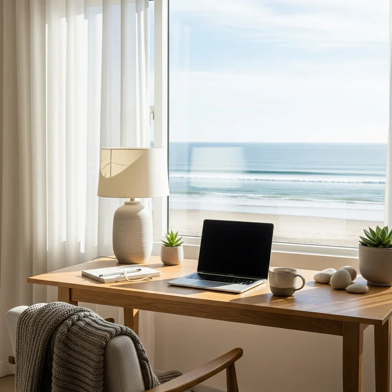 A secondary seating area transforms your coastal office from purely functional workspace into a versatile environment that supports different work modes and necessary breaks. Select a chair that invites lingering – perhaps a classic rattan peacock chair updated with plush cushions in natural linen, or a modern swivel chair upholstered in durable performance fabric featuring subtle nautical stripes. Position this retreat near a window to maximize natural light and create a dedicated reading nook for reviewing documents away from screen glare. Add a small side table in weathered wood or woven rattan to hold coffee, notebooks, or that beach-themed novel you're enjoying during lunch breaks. Layer textures with a cable-knit throw in ocean blue or sandy beige, providing warmth on cool mornings while adding visual softness. This alternative seating becomes crucial for phone calls, brainstorming sessions, or simply changing perspective when you're stuck on a problem. The goal is creating a mini oasis within your office that supports both productivity and restoration.