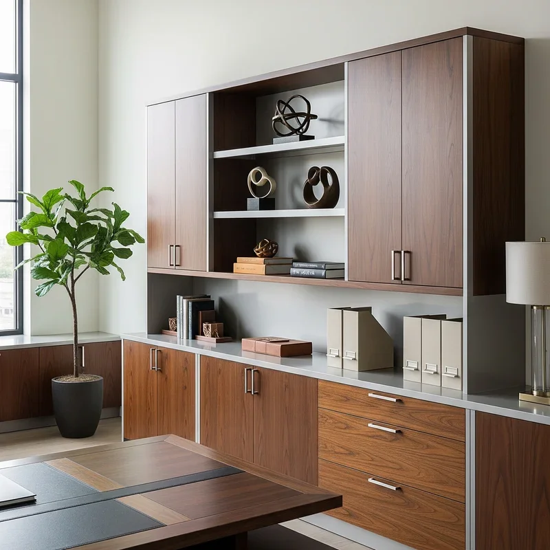 Premium materials elevate your office from functional to exceptional, creating an environment that inspires excellence in everyone who enters. Leather-wrapped drawer pulls and door handles add tactile luxury that visitors subconsciously notice and appreciate. Marble or granite surfaces on side tables provide durability while signaling attention to quality and detail. Custom millwork creates built-in elegance that mass-produced furniture can never match, perfectly fitting your space's unique dimensions. Hand-scraped hardwood floors or premium carpet tiles dampen sound while providing sophisticated foundations for your design. Bronze or brass hardware adds warmth and richness that plastic or chrome alternatives lack entirely. Window treatments in silk or high-quality linen filter light beautifully while maintaining privacy during sensitive discussions. These finishing touches demonstrate success without ostentation, creating spaces that feel both impressive and inviting.