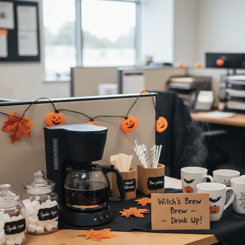 Transform your office coffee station into a witch's brew bar that makes morning caffeine runs more magical and entertaining. Label coffee pots with spooky names like "Liquid Motivation Potion" or "Morning Zombie Cure," and decorate the area with plastic cauldrons, rubber rats, and artificial cobwebs that don't interfere with functionality. Create custom cup sleeves with Halloween designs, provide themed stirrers shaped like broomsticks or bones, and offer seasonal flavors like pumpkin spice or apple cider to enhance the experience. Add a menu board listing drinks with creative Halloween names and their "magical" effects on productivity, bringing humor to the daily coffee ritual. This decoration directly impacts employee satisfaction by making a routine activity special while encouraging water cooler conversations that build workplace community. The coffee station becomes a destination that brightens everyone's day throughout the Halloween season.