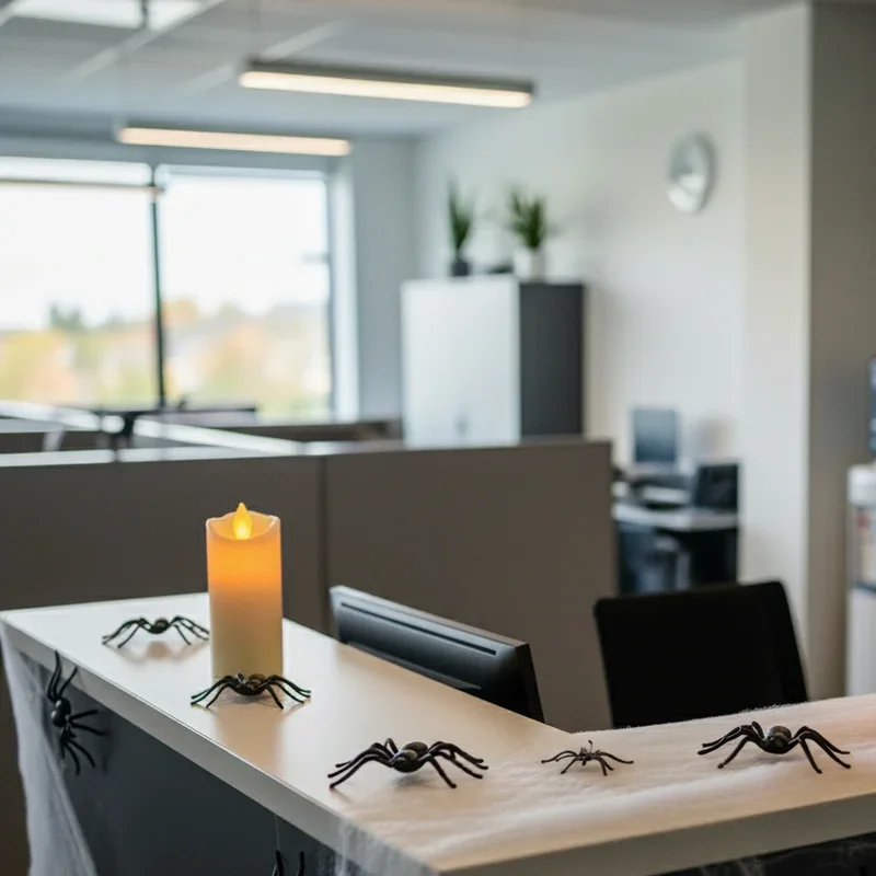 Your reception desk serves as the first impression for anyone entering your office, so why not make it memorably spooky? Transform this high-traffic area with artificial spider webs draped across the corners, LED candles flickering mysteriously, and a fog machine creating an eerie atmosphere that sets the Halloween mood instantly. Add a motion-activated skeleton greeter or a bowl of candy with a fake hand that grabs visitors when they reach for treats. You can incorporate professional elements by dressing up your company logo with subtle Halloween touches like tiny bats or orange and black ribbons. This transformation shows clients and employees alike that your company knows how to balance professionalism with seasonal fun, creating an inviting yet festive entrance that gets everyone excited about Halloween.