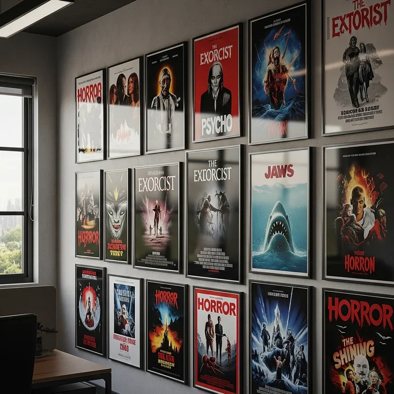 Convert blank hallway walls into a curated gallery of classic and modern horror movie posters that celebrate cinema while decorating for Halloween. Choose workplace-appropriate options that lean more toward vintage Universal Monsters or campy B-movies rather than graphic modern horror, ensuring all employees feel comfortable with the display. Arrange posters chronologically to show horror evolution, by subgenre to highlight variety, or by color scheme to create a visually cohesive gallery that doubles as conversation-starting art. Add museum-style plaques with fun facts about each film, creating an educational element that justifies the decoration as culturally enriching rather than purely festive. This sophisticated approach to Halloween decorating appeals to film buffs while maintaining professional aesthetics that won't alienate clients or employees who aren't horror fans. The gallery can spark discussions about favorite scary movies and Halloween traditions across generations.