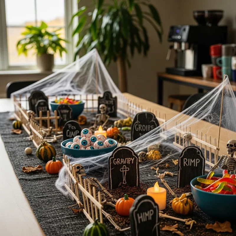 Transform your break room into a spooky graveyard where employees can enjoy lunch among the tombstones and enjoy some Halloween humor. Create cardboard tombstones with funny epitaphs related to office life like "RIP Deadline: Missed but Not Forgotten" or "Here Lies The Printer: It Never Worked Anyway" for workplace-specific laughs. Arrange artificial grass or green fabric on tables, add plastic skeleton hands emerging from the "ground," and scatter autumn leaves for authentic graveyard ambiance without being too morbid. Position battery-operated candles around the room for atmospheric lighting during lunch breaks, and play subtle Halloween sound effects at low volume for added immersion. This transformation makes breaks more entertaining and gives employees something to look forward to during their downtime while maintaining functionality for eating and relaxing. The humorous approach keeps things light while fully embracing Halloween's spooky traditions.