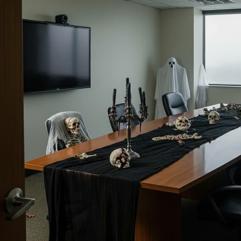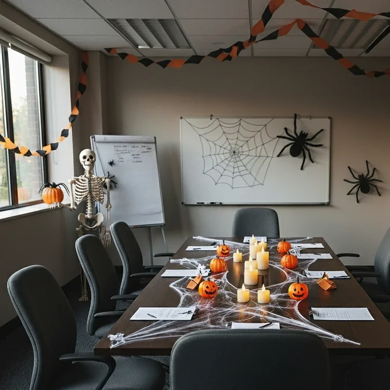 Turn your meeting spaces into haunted chambers where productivity meets spookiness in perfect harmony. Replace regular lighting with orange and purple string lights, hang lightweight fabric ghosts from the ceiling, and place battery-operated candles on the conference table for atmospheric meetings. Add removable wall decals of haunted trees, flying witches, or creepy silhouettes that won't damage paint when removed after the season. Consider swapping out regular chairs with Halloween-themed seat covers featuring pumpkins, skulls, or witch hats for an extra touch of whimsy. You can even create themed meeting agendas with Halloween fonts and borders to maintain the festive spirit during serious discussions. This approach keeps meetings engaging while showing that your workplace values both hard work and seasonal celebration, making even budget reviews feel less daunting.