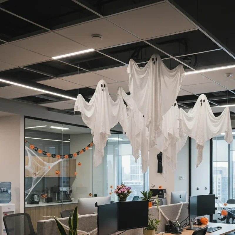 Create an ethereal atmosphere by suspending friendly ghosts throughout your office space using fishing line and white fabric or tissue paper. These lightweight spirits can dance in the air conditioning currents, adding movement and whimsy to otherwise static office environments while being easy to install and remove. Vary the heights and sizes of your ghosts to create visual interest, placing larger ones in open areas and smaller ones in corridors or above individual workstations. Add glow-in-the-dark paint to ghost faces for a surprise element when lights dim for presentations or evening work sessions. This decoration works particularly well in offices with high ceilings or open floor plans where the floating effect really shines. The ghosts serve as conversation pieces that lighten the mood during stressful projects while maintaining a playful rather than scary vibe.