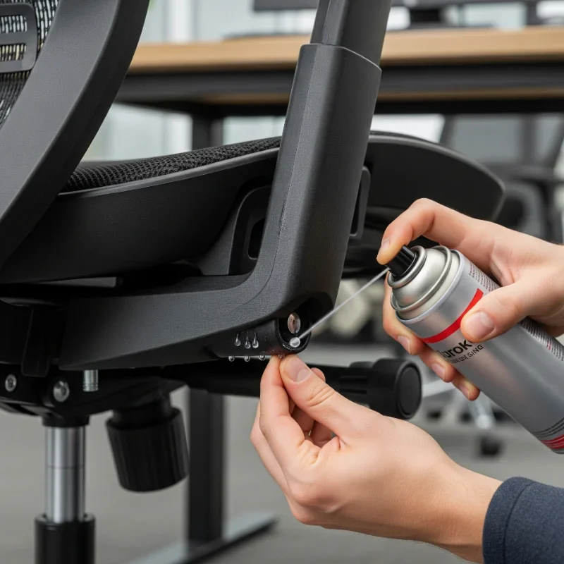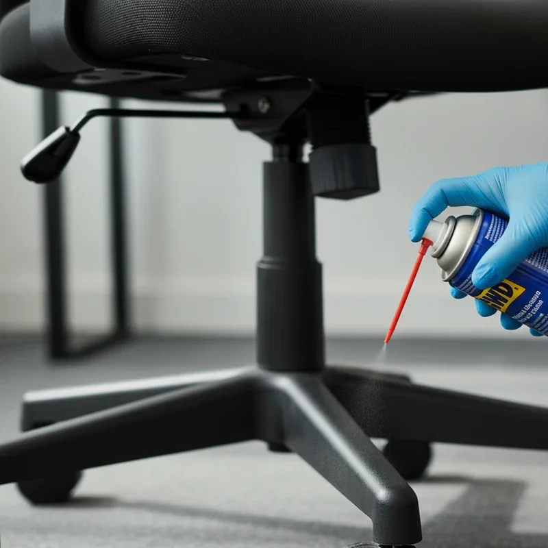 Apply white lithium grease to heavy-duty pivot points and silicone spray to plastic components. Work the chair through its full range of motion to distribute the lubricant evenly.