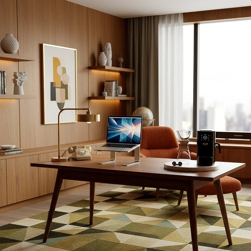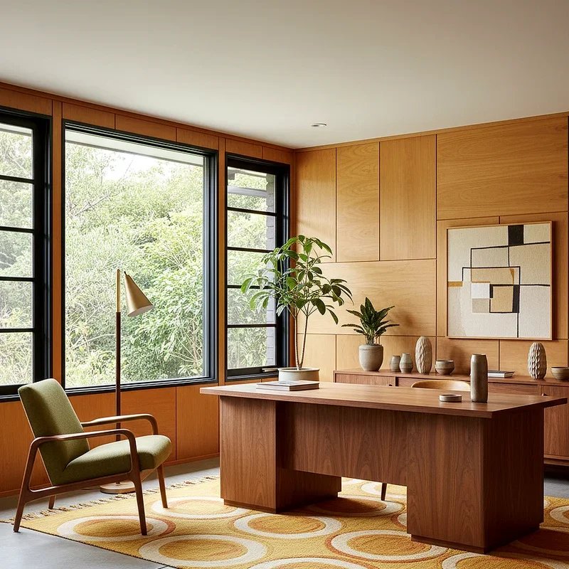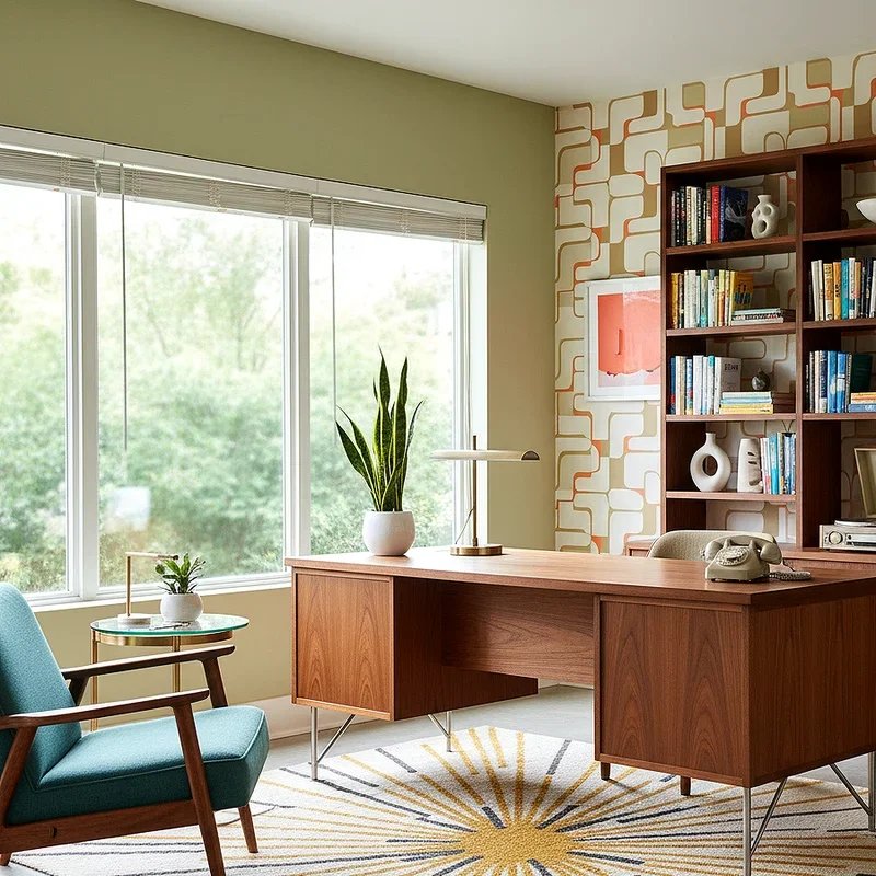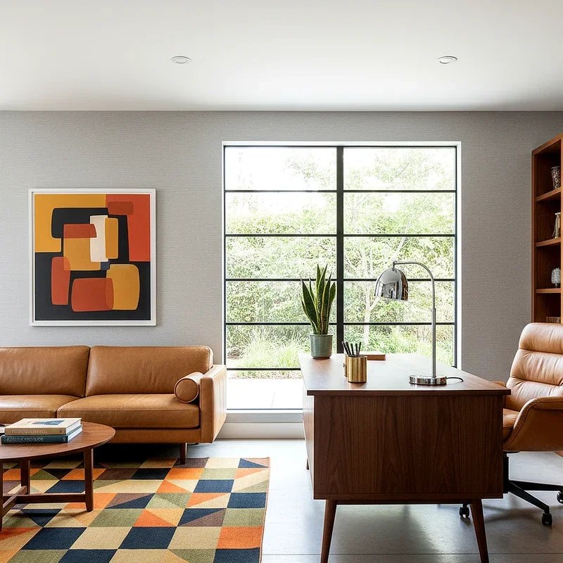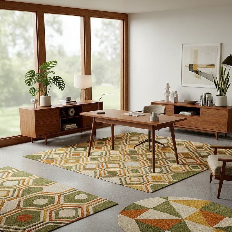 Your floor deserves as much attention as your walls, and a geometric patterned rug instantly anchors your mid century modern office space. These rugs do double duty, defining your work area while adding personality through bold patterns inspired by atomic age designs. Think diamonds, hexagons, or abstract shapes in colors that complement your overall palette without overwhelming the space. A well-chosen rug also provides acoustic benefits, absorbing sound in those endless video meetings while protecting your floors from chair wheels. Size matters here; ensure your rug extends beyond your desk area to create visual boundaries that psychologically separate work from the rest of your space. Whether you prefer muted earth tones or vibrant oranges and teals, geometric rugs add that perfect finishing touch.