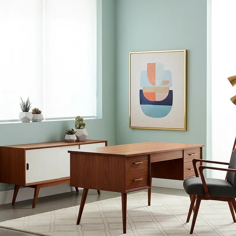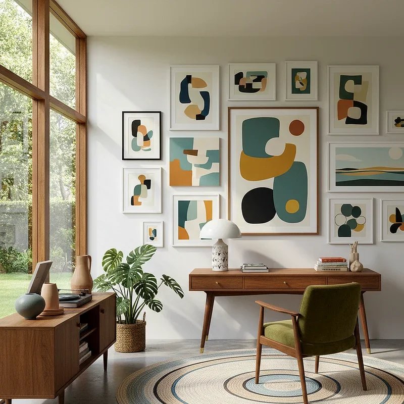 Blank walls are missed opportunities in any office, especially when abstract art can inject personality and inspiration into your daily grind. Mid century modern art celebrates bold colors, organic shapes, and experimental compositions that stimulate creativity without demanding attention. Mix original pieces with quality prints, varying frame sizes and orientations for dynamic visual flow that keeps your eyes engaged during thinking breaks. Consider works inspired by Rothko's color fields or Calder's playful mobiles, choosing pieces that resonate with your personal aesthetic while maintaining period authenticity. The key is creating cohesion through consistent framing, perhaps using thin black or natural wood frames that don't compete with the artwork. This personal gallery transforms sterile office walls into sources of daily inspiration and conversation starters.