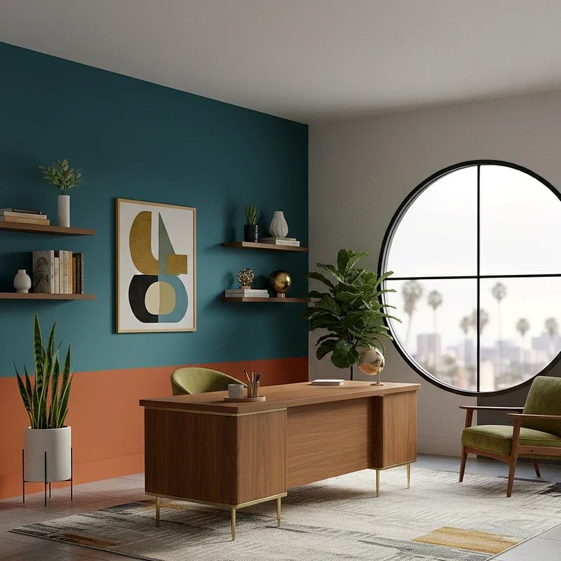 Who says offices must stick to boring beige when color blocking can inject energy and personality into your workspace? Mid century modern design celebrated bold color choices, from burnt orange to olive green, creating focal points that energize without overwhelming. Choose one wall for dramatic impact, perhaps behind your desk or surrounding built-in shelving, painting it in a saturated hue that complements your furniture's wood tones. This technique defines zones within larger spaces or makes small offices feel intentionally designed rather than afterthoughts. The key is selecting colors that inspire rather than distract, considering how different hues affect mood and productivity throughout the day. Pair bold walls with neutral furniture to prevent visual chaos, letting color serve as backdrop rather than competition for your attention during work sessions.