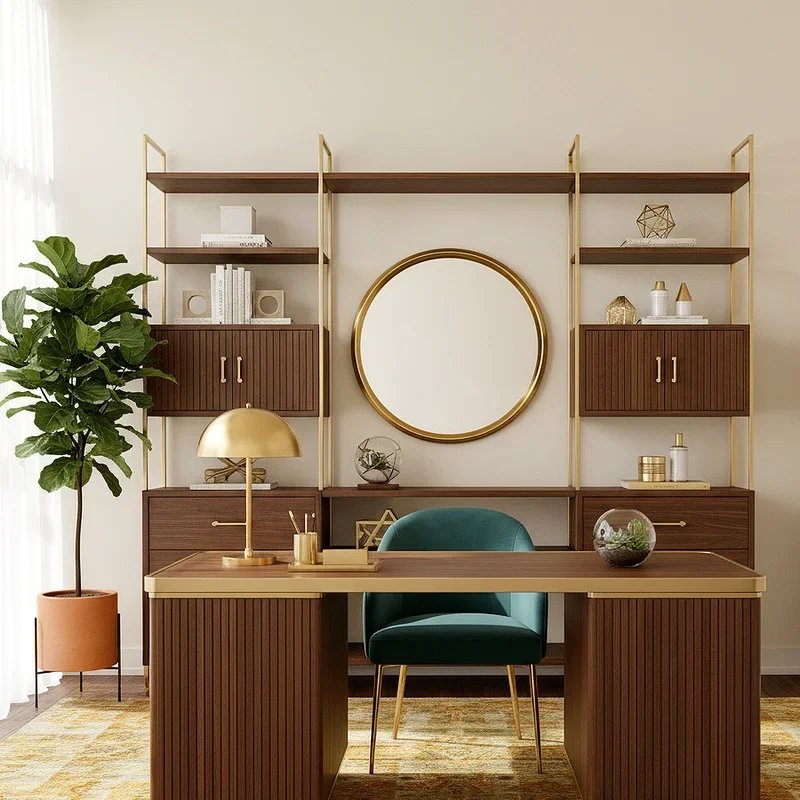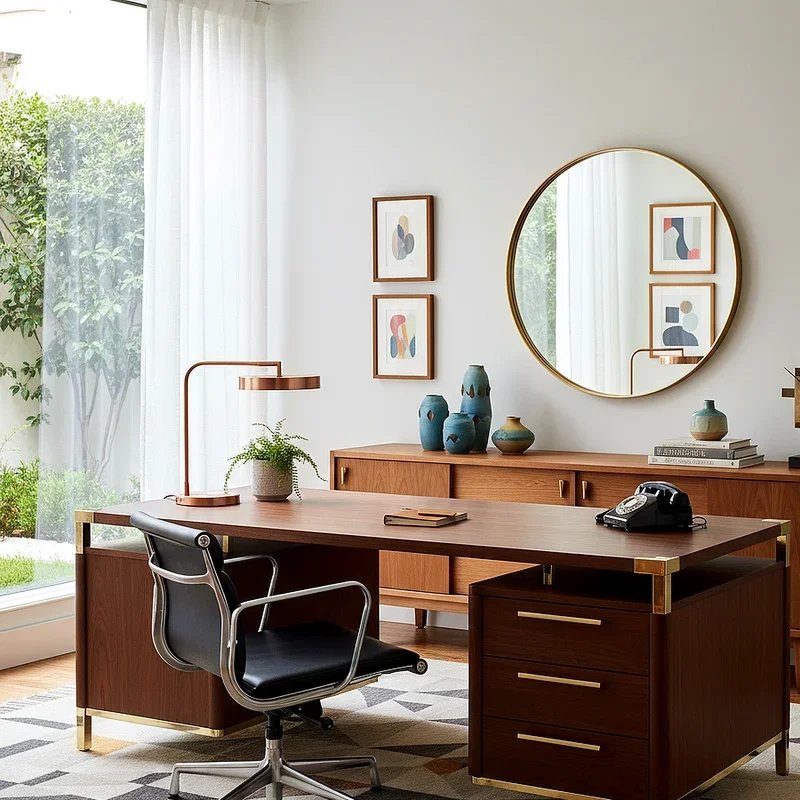 Sometimes it's the smallest details that make the biggest impact, and brass or gold hardware serves as the jewelry of your mid century modern office. Swap out those generic chrome drawer pulls for warm brass alternatives, choose gold-framed mirrors, or select desk accessories with metallic accents that catch the light beautifully. These warm metals complement wood tones perfectly while adding sophistication without screaming luxury. The trick is restraint; you want touches of brass throughout the space rather than an overwhelming gold rush. Consider brass desk lamps, picture frames, or even a vintage brass letter holder that combines form with function. These metallic elements create visual continuity, tying together disparate pieces while maintaining that effortless mid century vibe that never feels forced or overly decorated.