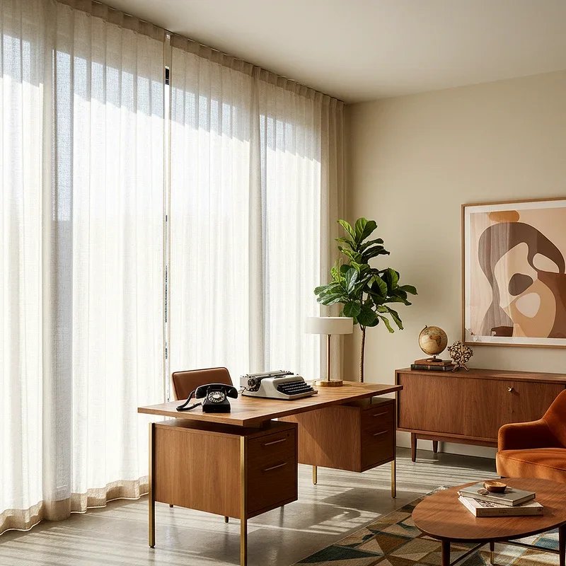 Natural light transforms any workspace from dreary to dreamy, but harsh glare can make screen work impossible, which is where sheer curtains become your best friend. These lightweight window treatments filter sunlight beautifully, creating that soft, diffused glow that makes everything look better, including you on video calls. Choose neutral tones that complement your color scheme without competing for attention, perhaps in linen or cotton blends that move gracefully with air currents. The key is maintaining privacy without sacrificing brightness, allowing you to work comfortably throughout the day without constantly adjusting blinds. Layer sheers with heavier curtains for flexibility, controlling light levels based on tasks or time of day. This simple addition softens hard architectural lines while maintaining that airy, open feeling essential to mid century modern design philosophy.