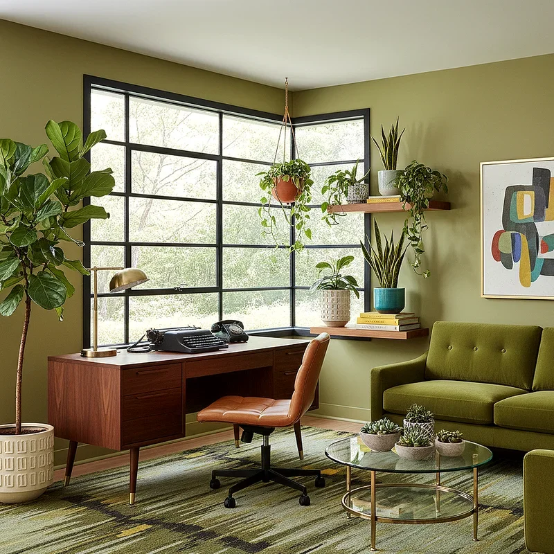 Nothing breathes life into an office quite like actual living plants displayed in period-appropriate ceramic planters that complement your mid century aesthetic. Snake plants, rubber trees, or fiddle leaf figs thrive in office environments while adding organic shapes that soften hard edges and purify air naturally. Choose planters in classic mid century colors like mustard yellow, burnt orange, or sage green, selecting designs with interesting textures or patterns that add visual interest without overwhelming plant displays. Position plants strategically to create natural dividers, frame windows, or add height to corners that might otherwise feel forgotten. The combination of living greenery and vintage-inspired ceramics creates biophilic design that reduces stress while maintaining style consistency. These natural elements remind us that even in our most productive spaces, connection to nature enhances both wellbeing and creativity simultaneously.
