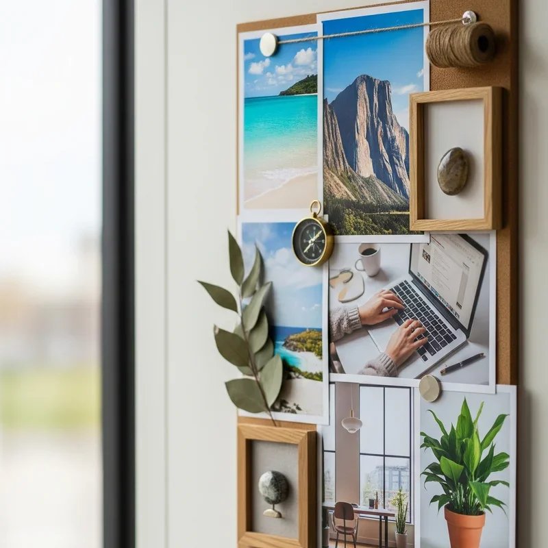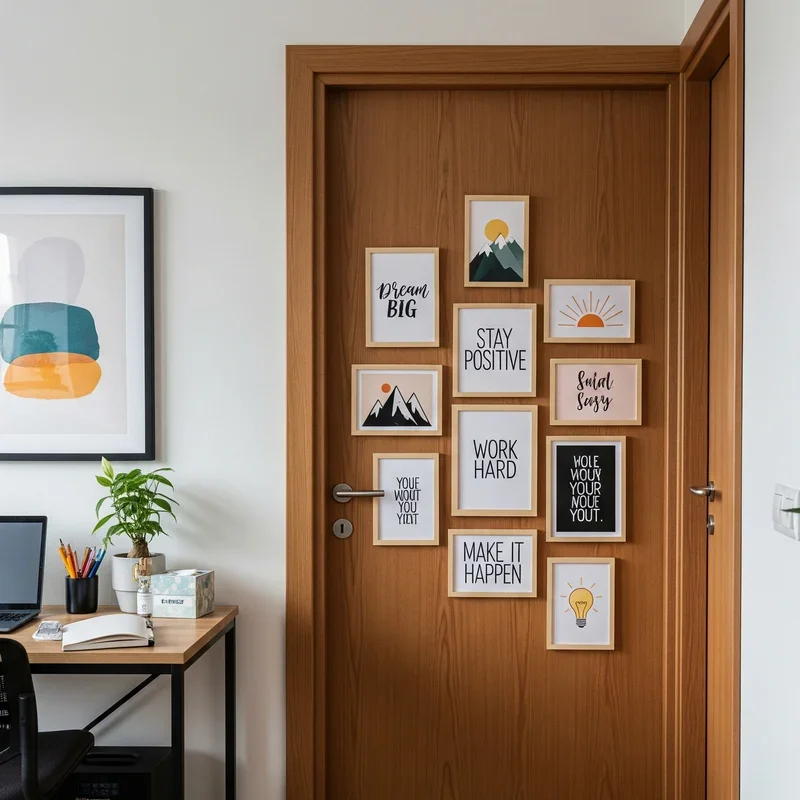 Creating a photo collage on your office door personalizes your workspace while building connections with colleagues who share similar interests or experiences. Arrange team photos from company events, project celebrations, or casual Friday gatherings to showcase your collaborative spirit and memorable moments. Mix professional achievements with carefully selected personal photos that maintain workplace appropriateness while revealing your personality beyond spreadsheets and meetings. Consider themed collages like travel destinations, inspiring landscapes, or even pet photos that serve as conversation starters with visiting clients or new team members. Use removable adhesive strips or magnetic frames to protect your door while allowing easy updates when new photo-worthy moments arise. The visual storytelling aspect of photo collages makes your door a destination rather than just a passage, inviting people to pause and connect.