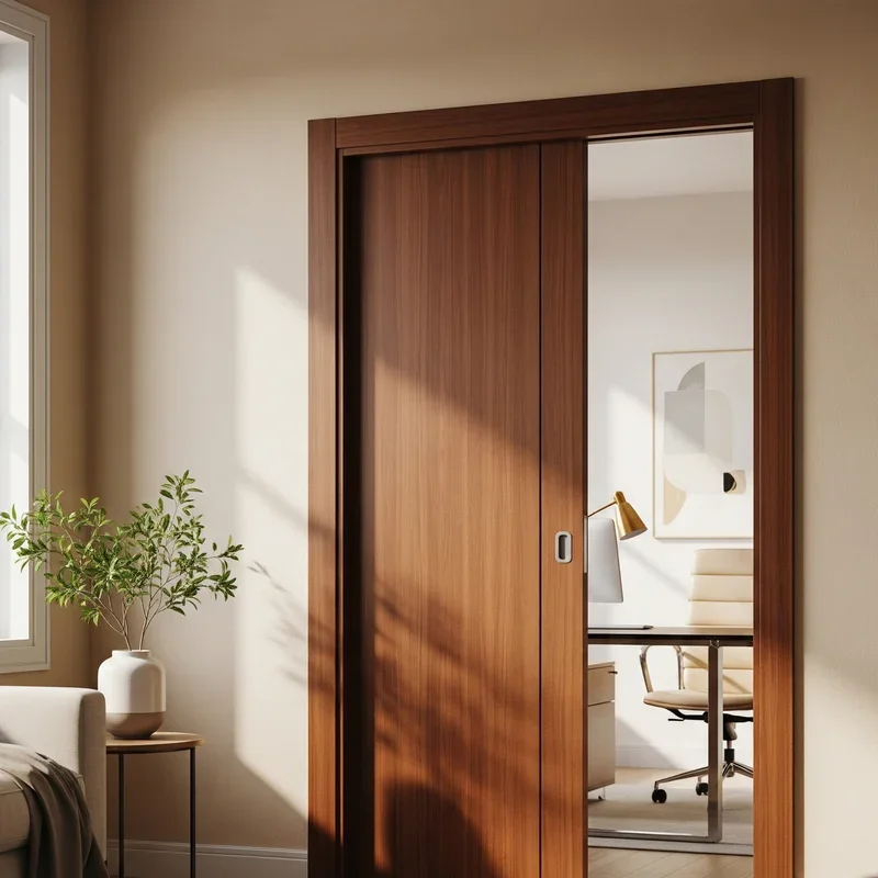 A: Pocket doors or sliding doors maximize space in compact office environments.