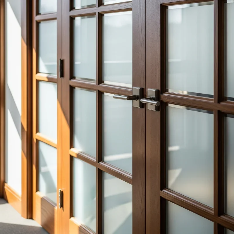 Frosted glass doors strike the perfect balance between openness and privacy, making them ideal for offices that value both collaboration and confidentiality. The etched or sandblasted surface diffuses light while obscuring direct views, creating a sense of privacy without the isolation that solid doors can bring. You can customize the frosting patterns, from full coverage to strategic bands or logos that reinforce your brand identity while maintaining functionality. These doors work exceptionally well in human resources offices, medical facilities, or creative studios where natural light is valued but visual privacy remains important. The soft, diffused light they create reduces glare on computer screens while maintaining a bright, welcoming atmosphere that keeps spaces feeling connected to the broader office environment.