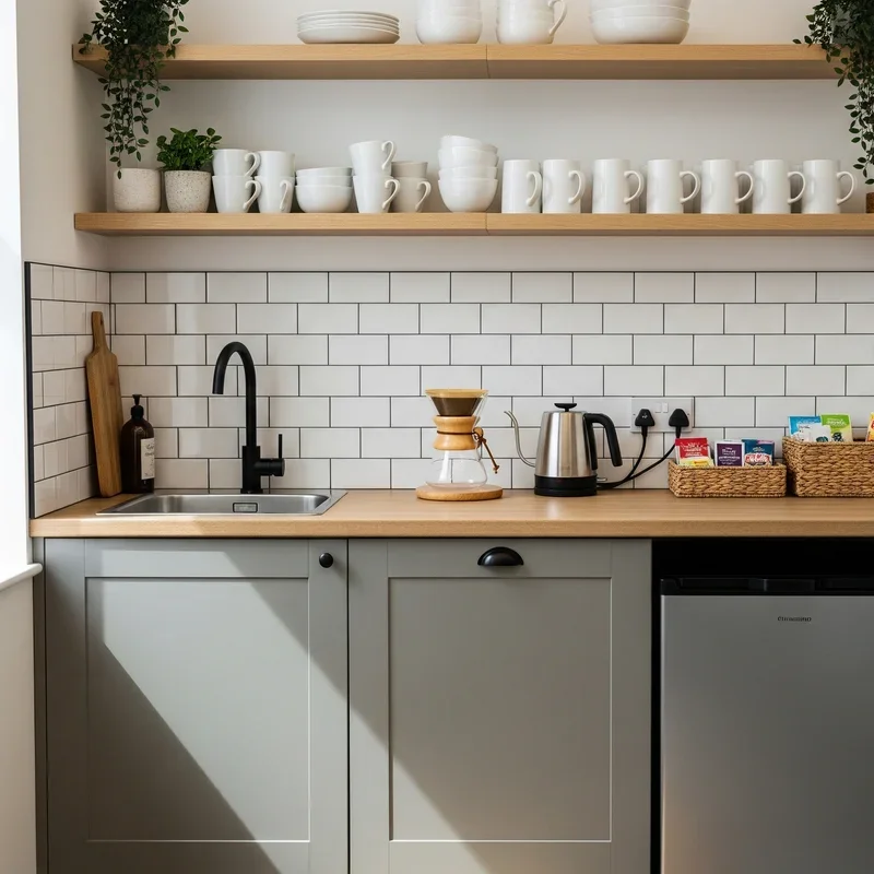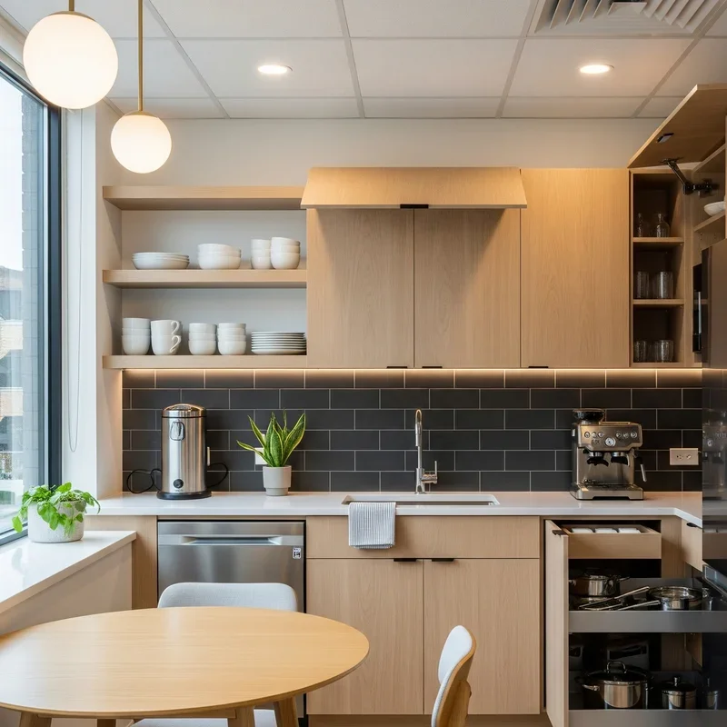 Open shelving transforms your office kitchen from a closed-off utility space into an inviting, accessible area that encourages use. By displaying dishes, mugs, and supplies in plain sight, you create a sense of transparency and community ownership that hidden cabinets simply can't match. This design choice makes everything easier to find, reducing the frustration of searching through multiple cabinets for that one specific item. Plus, open shelves provide the perfect opportunity to showcase attractive dishware or add decorative elements that reflect your company culture. Consider mixing functional items with small plants or artwork to create visual interest while maintaining practicality in your modern office kitchen setup.