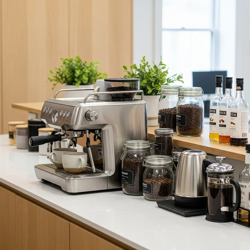 Creating a premium coffee station shows employees you value their comfort and daily rituals, transforming mundane coffee breaks into moments of genuine enjoyment. Start with a quality espresso machine or coffee maker as your centerpiece, then surround it with all the essentials like various milk options, sweeteners, and flavor syrups arranged in an intuitive layout. Add a small refrigerator nearby for milk and creamer, install hooks for mugs, and include a knock box for espresso grounds if you go that route. Don't forget the finishing touches like a menu board displaying drink options or coffee brewing instructions that make everyone feel like a barista. This investment in quality coffee culture pays dividends in employee satisfaction and provides a natural gathering point for spontaneous collaboration.