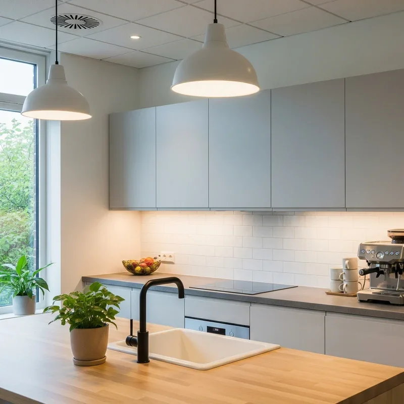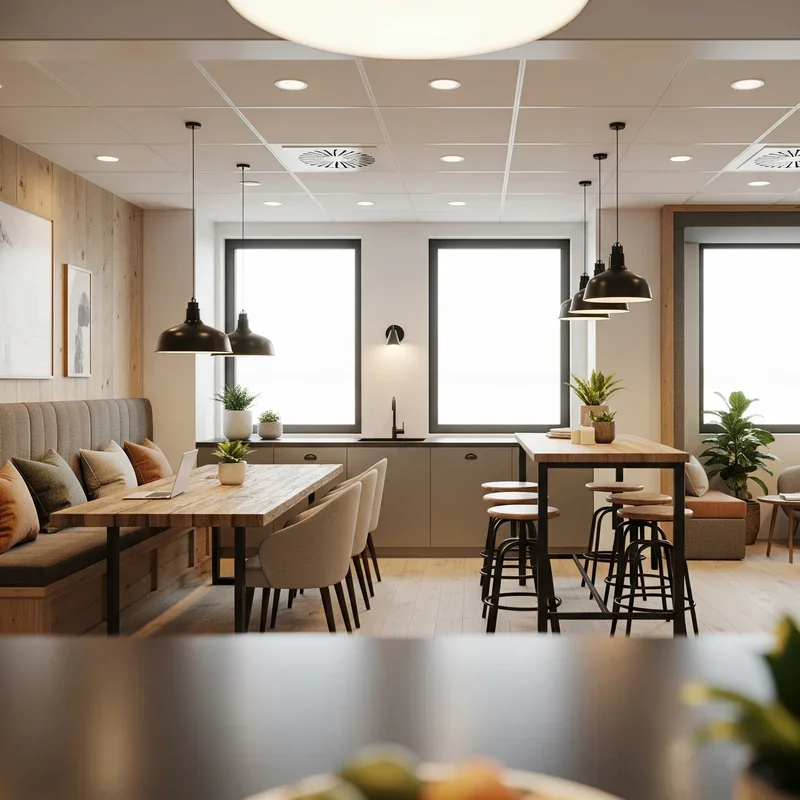 Nothing beats natural light for creating an uplifting atmosphere that energizes rather than drains your team throughout the day. If your office kitchen has windows, maximize their impact by keeping treatments minimal and arranging seating to take advantage of views and sunlight. For spaces without windows, consider installing skylights or solar tubes to bring daylight deep into the building's interior. Supplement natural light with warm LED fixtures that mimic daylight patterns, avoiding harsh fluorescents that can make even the nicest space feel institutional. Position task lighting over work surfaces like coffee stations and prep areas while using ambient lighting to create a welcoming glow during darker hours or cloudy days.