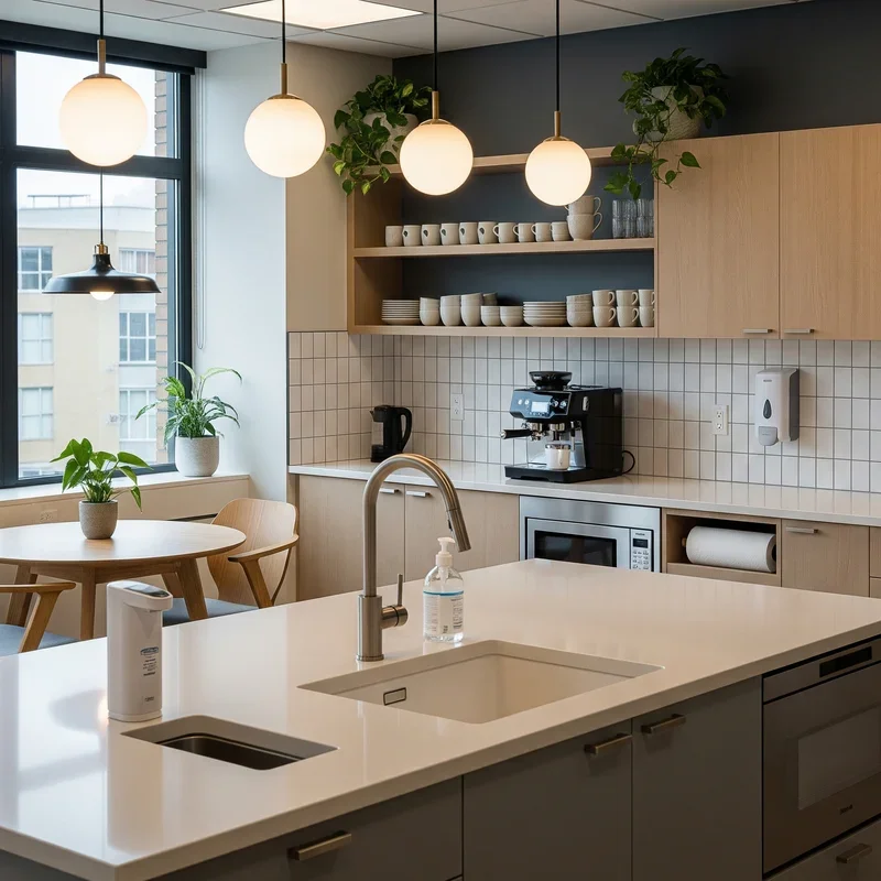 Post-pandemic workplace design demands visible commitment to hygiene without making the space feel clinical or unwelcoming. Install touchless faucets and soap dispensers that reduce contact points, position hand sanitizer stations at entrances and exits, and ensure adequate ventilation through windows or quality air filtration systems. Create clear cleaning stations with readily available supplies and posted schedules that show when surfaces were last sanitized, building confidence in shared space safety. Choose materials like quartz or stainless steel that resist bacteria naturally and clean easily, avoiding porous surfaces that harbor germs despite regular cleaning. Make cleanliness convenient by placing multiple trash bins, providing disposable towels alongside cloth options, and ensuring dishwashers reach proper sanitizing temperatures for truly clean dishes.