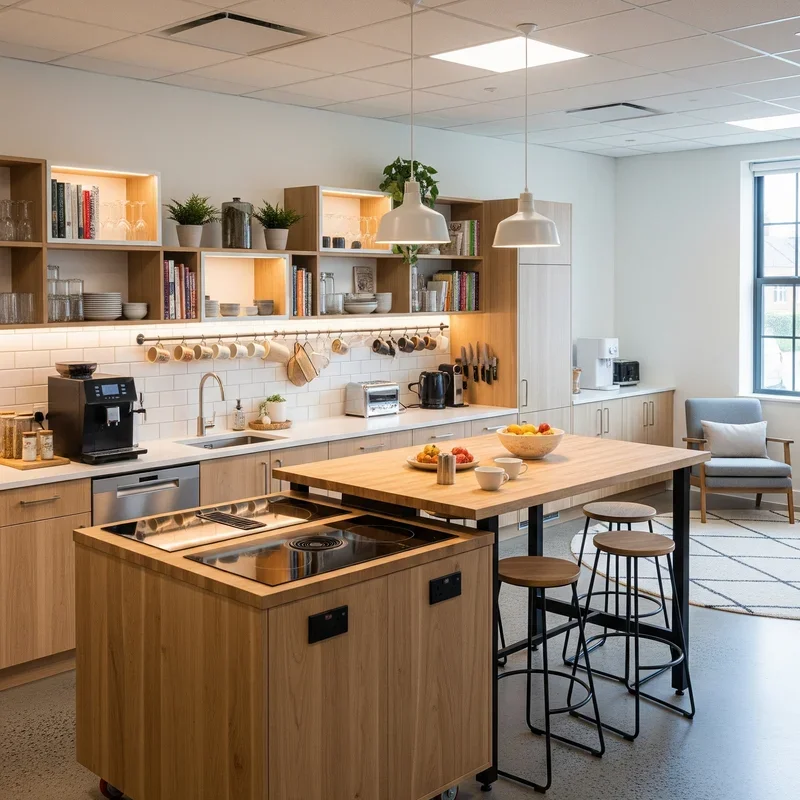 Design your office kitchen to adapt seamlessly between different uses throughout the day, from morning coffee rushes to afternoon team meetings to evening social events. Include moveable furniture like rolling carts and lightweight tables that can reconfigure quickly when you need more prep space or want to host a larger gathering. Install retractable or fold-down surfaces that provide extra counter space when needed but tuck away during quieter times to maintain an open, uncluttered feel. Consider zones that serve multiple purposes, like a bar-height counter that works for quick meals, informal meetings, and party buffets depending on the occasion. This flexibility ensures your kitchen investment delivers value beyond just meal times, becoming a true multipurpose space that adapts to your team's evolving needs.