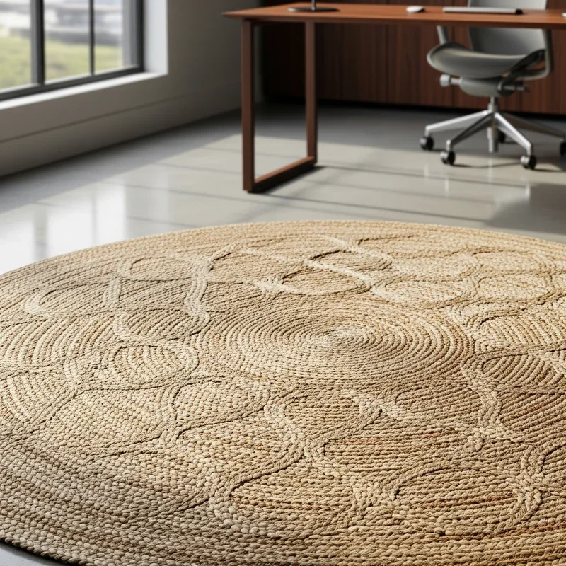 Round rugs introduce organic curves into offices dominated by rectangular desks, square tiles, and angular furniture, creating visual balance and flow. These circular pieces work exceptionally well under round tables, in reading nooks, or as focal points in reception areas. The absence of corners makes round rugs ideal for smaller offices where every inch counts, as they create the illusion of more space. Their shape naturally draws people together, making them perfect for collaborative areas or informal meeting spaces within larger offices. Round rugs also excel at defining specific zones within open floor plans without creating harsh divisions between areas. The key to successfully incorporating round rugs lies in choosing sizes that properly anchor furniture arrangements while leaving adequate floor space visible around edges.