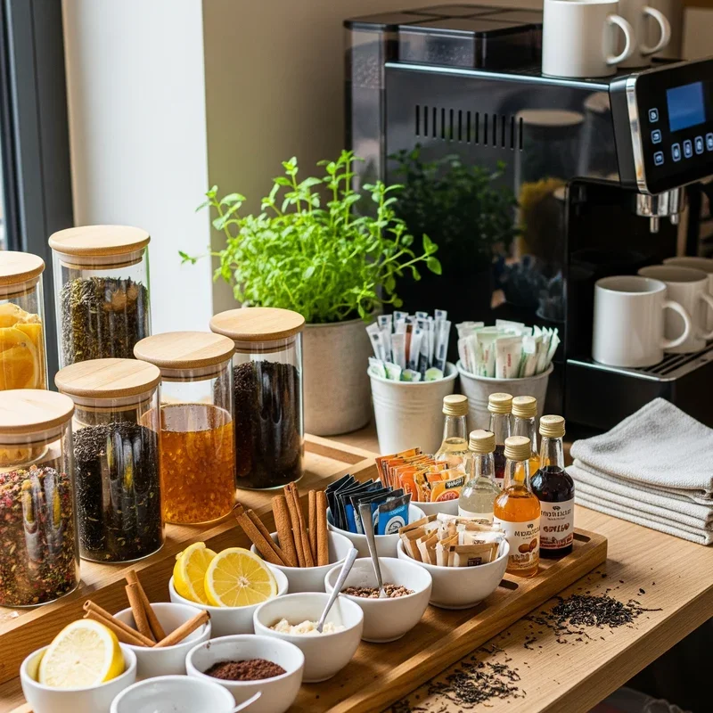 Beyond basic coffee service, create a comprehensive beverage station that caters to various preferences and energy needs throughout the day. Stock an array of herbal teas including chamomile for stress relief, peppermint for digestion, green tea for antioxidants, and energizing options like yerba mate. Provide natural sweeteners like honey, agave, and stevia alongside traditional options. Include flavor enhancers such as cinnamon sticks, vanilla extract, and cocoa powder for coffee customization. Add non-dairy milk alternatives including almond, oat, and coconut milk to accommodate lactose-intolerant team members. This station encourages hydration while providing gentle energy boosts without the jitters associated with excessive caffeine consumption. The ritual of preparing a warm beverage also offers a mental break that can enhance productivity when returning to tasks.