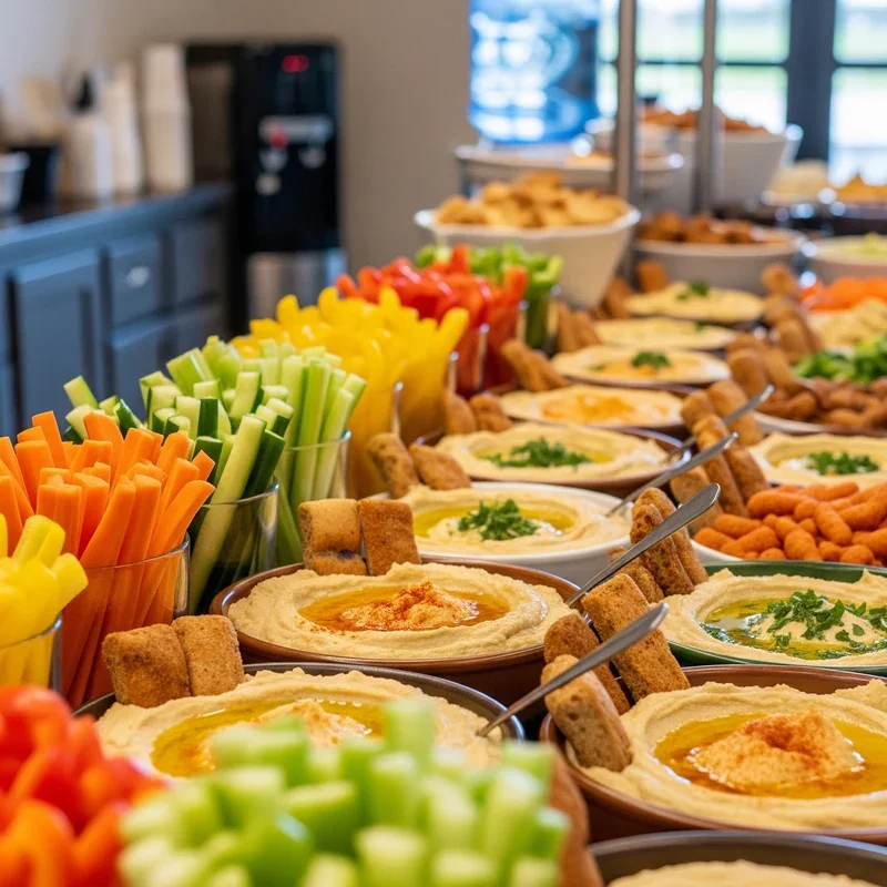 Crunchy vegetables paired with creamy hummus create the perfect combination of texture and flavor that satisfies without weighing people down. Pre-cut carrots, celery, bell peppers, cucumber rounds, cherry tomatoes, and snap peas into convenient portions stored in water to maintain crispness. Offer various hummus flavors including classic, roasted red pepper, garlic, and spicy varieties to prevent taste bud boredom. Include other healthy dips like tzatziki, guacamole, or bean dips for variety. This station provides essential vitamins, minerals, and fiber that support cognitive function and sustained energy levels. The act of crunching on vegetables can also help reduce stress and improve focus during challenging tasks. Position this hub near workstations for easy access during conference calls or while answering emails, making healthy snacking effortlessly convenient.