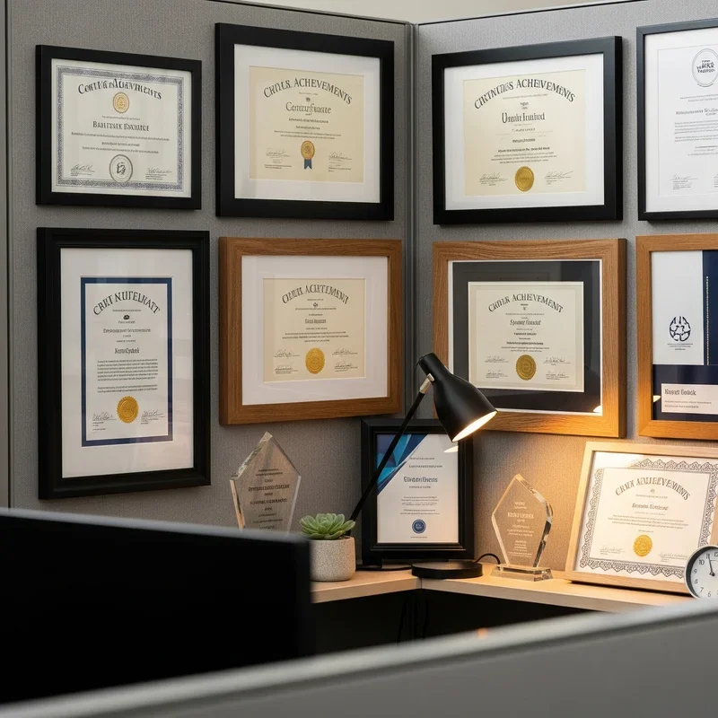 Your accomplishments deserve to be celebrated, not hidden in a drawer somewhere. Create a professional display of your certificates, awards, and achievements that serves as both decoration and motivation. Use matching frames for a cohesive look or mix styles for a more eclectic gallery. Include professional development certificates, team recognition awards, or even personal milestones that inspire you. This display serves as a visual resume and confidence booster during challenging projects. Arrange them thoughtfully rather than cluttering every inch of wall space. Consider including a small shelf for three-dimensional awards or trophies. This achievement wall reminds you of your capabilities and growth while subtly showcasing your expertise to colleagues and supervisors who visit your space.