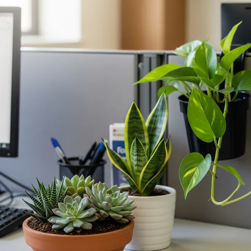 A: Snake plants and ZZ plants thrive in low-light office environments.
